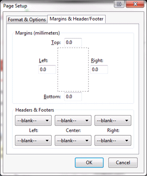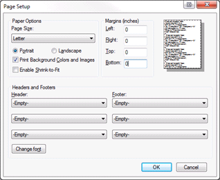 In order to maximize the space on each sheet of paper, verify that the Headers and Footers are disabled. To verify your page settings, attempt to print a document and verify that the "Headers and footers" box is unchecked.