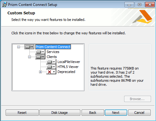 - The Custom Setup screen allows you to define what components of Prizm Content Connect you want to install.