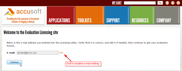 Once at the Evaluation Licensing website, the e-mail address you entered into the Prizm Licensing Utility will already be pre-populated. If you notice an error in your e-mail address, you can correct it at this time by clicking the Edit link.