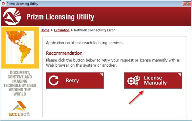 Click the Retry button if you are aware of an Internet connection issue that has been resolved. Otherwise, click the License Manually button to begin the Manual Licensing Process.