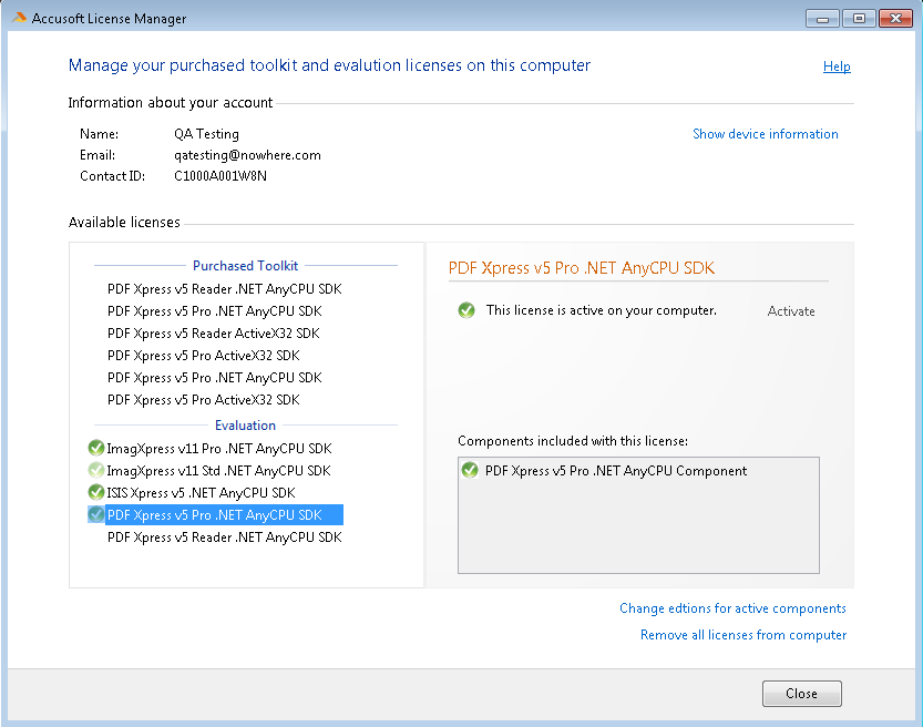 You can access the License Manager at: Start > All Programs > Accusoft > Common > License Manager. |