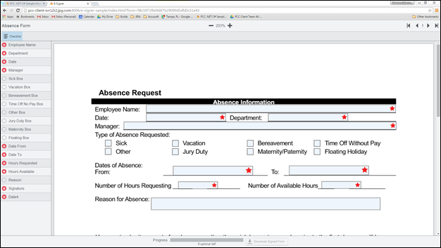 Here you can see the field layout that users will see. The fields with red stars are the required fields and the progress bar at the bottom of the screen illustrates how complete the required fields are in the form. Once all required fields have been completed, the "Download Signed Form" button will be enabled, allowing the user to download a PDF of the fully completed form as shown below: