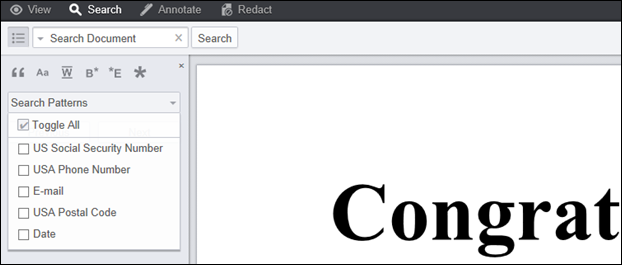 Predefined Search can also be specified using a text file (predefinedSearch.json). The predefinedSearch.json file provides several sample search terms and custom regular expressions; the file is parsed by the web-tier and loaded in the Viewer. The following example shows you how: