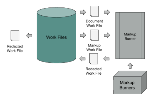 Markup Burners are processes that create a "burned" document Work File as output from a source document Work File and a markup Work File describing redactions or annotations.