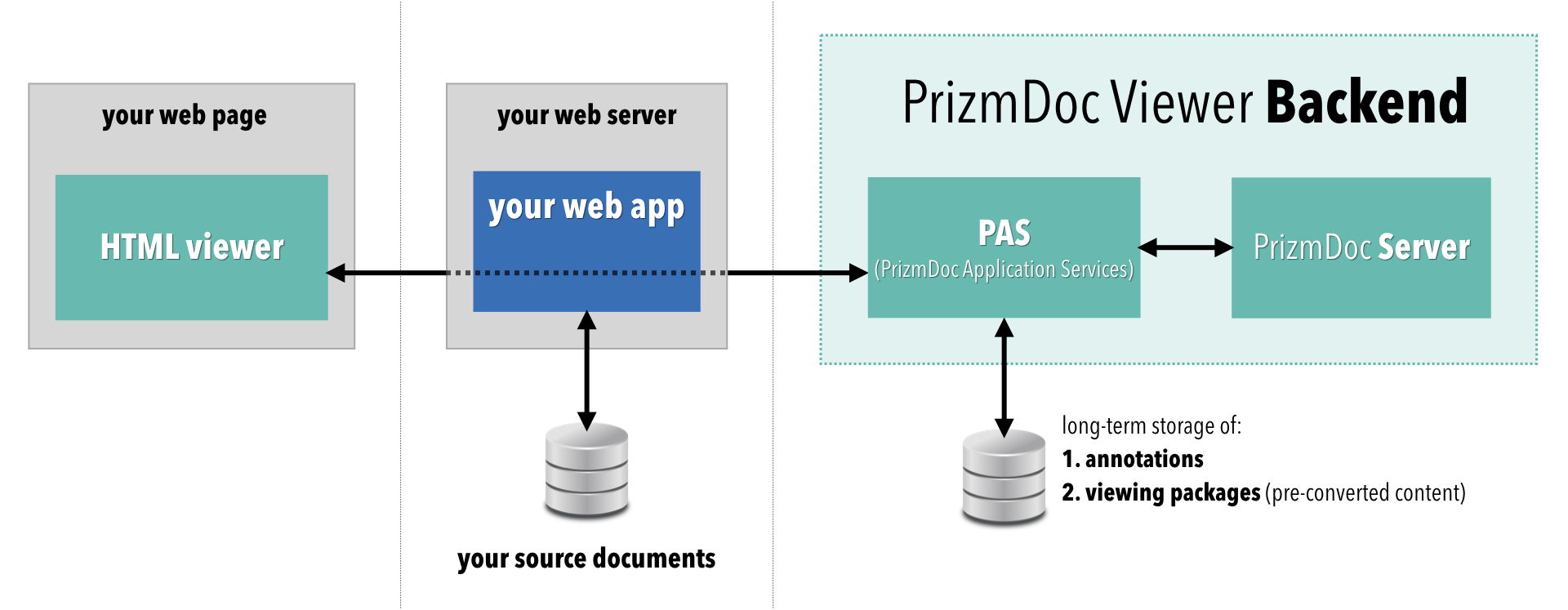 The backend is made up of two tiers, PAS (PrizmDoc Application Services) and PrizmDoc Server: