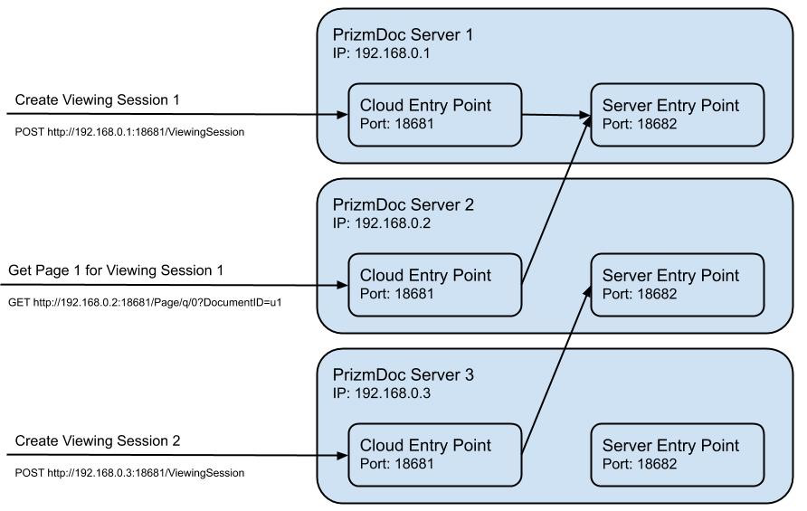 If you are working with an existing resource, the CEP will ensure that the request is forwarded on to the server which originally created the resource. Any CEP can route any request to the correct server. This allows you to use a simple load balancer in front of your PrizmDoc Servers; simply have the load balancer send incoming requests to any CEP on any server and the CEP's will ensure that the requests are routed to the appropriate machine.