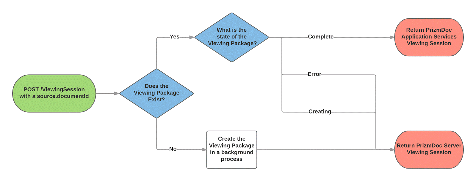 This request will always return a viewingSessionId regardless of the status of the matching Viewing Package. If a Viewing Package does not currently exist with the given documentId, PrizmDoc Server will handle document viewing while a background process creates a Viewing Package. Once the background process is complete, PAS will handle all further viewing sessions until the Viewing Package expires (24 hours by default).