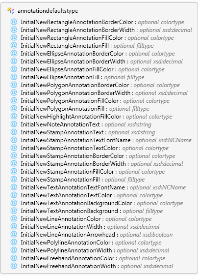 | InitialNewStampAnnotationTextColor | colortype Simple Type | optional | | | The InitialNewStampAnnotationTextColor attribute specifies the default text color. |