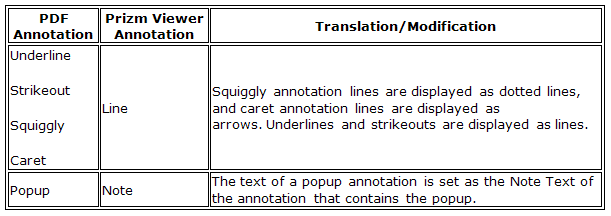 The following PDF embedded annotations do not have a direct equivalent within Prizm Viewer. These are translated as follows: