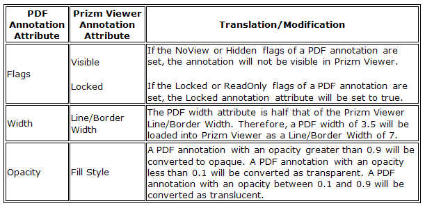 The following PDF supported annotation attributes do not have a direct equivalent within Prizm Viewer. These attributes are translated as follows: