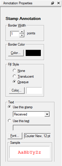 The following examples show annotation properties for the rectangle, note, and stamp annotations. Note that the Annotation Properties Docking Window will also display properties for the other annotations available in Prizm Viewer: ellipse, highlight, line, text, polyline, polygon, and freehand.