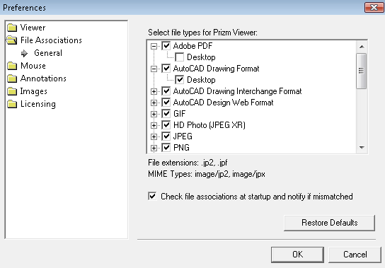 To ensure all of your file association preferences are maintained from one session of Prizm Viewer to the next, select the "Check file associations at startup and notify if mismatched" check box. By selecting this option, Prizm Viewer notifies you of any file associations that may have been changed due to an installation of another application that supports the same file associations or another user (who is an administrator). The file associations that have changed will appear "under-intensified" or "grayed out". To re-set your file associations, select or de-select the file associations as needed.