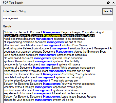 - Search button - After you enter the keywords and click Search, the label on the Search button will change to “Stop”, but the search operation will continue. While the search is being performed, keyword matches will display in the Results window until all of the PDF pages have been searched. If you click on the “Stop” button before all of the PDF pages have been searched, then the search will discontinue but any results found so far will be kept.