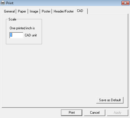 One printed inch is 1 CAD unit (1 is the default setting) - One printed inch is a definable CAD unit. CAD units may be anything from millimeters to parsecs, so this option allows you to provide a scale for printing. For example, if the CAD image uses miles as units, using the default setting of “1”, you will see 1 mile represented as an inch on the printed output.