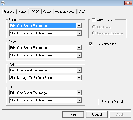 - Saving Settings - if you make selections in the Image tab and want those settings to remain as the default, click Save as Default.