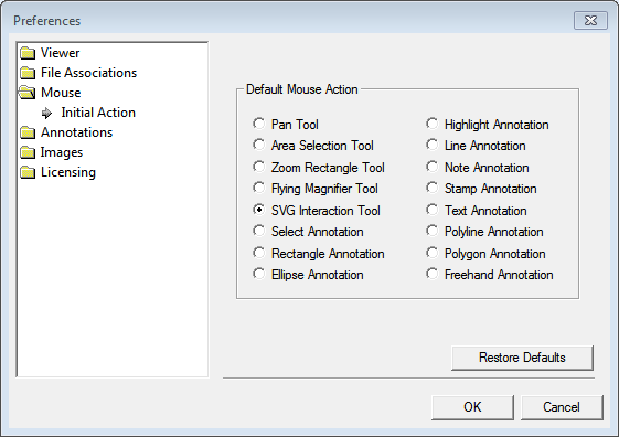 - Annotation editing must be enabled to select an annotation function as the default mouse tool. If annotation editing is not enabled, and an annotation function is selected as the default mouse action, the Zoom Rectangle will be used instead.