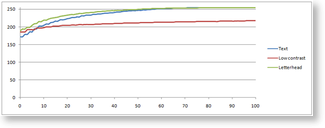 The low contrast image has a similar shape as well, but with much less change from the 0th to 100th percentile. This shows how the use of percentile brightness is relatively insensitive to changes in background and text color, because the same set of carefully chosen percentiles applied to all of these images will result in good output. This also illustrates the values chosen for noise and contrast in the analysis phase; contrast (difference between 1st and 50th percentile) will be 70 or greater for the letterhead image, and only 40 for the low contrast image. Noise(difference between 50th and 99th percentile) in both cases will be less than 10.