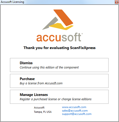 During evaluation of Accusoft products, Evaluation Toolkit licenses can be used to try out products. However, the product behavior is limited by trial dialog pop-ups, timeouts, or evaluation watermarks. When you determine the product is a good fit, you can purchase a Toolkit license to eliminate trial dialog pop-ups, timeouts, and evaluation watermarks.